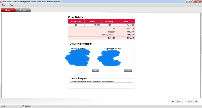 The site is having an extended promotion where the price to print 4R pictures is only 30 cents per piece, and provides free delivery for orders worth more than 35 ringgit. I thought this is a very reasonable price and it wouldn't hurt to try with last Raya pictures. So I downloaded the software "EOE Photo Express" from the site. Registration and all can be done through the software once installed so I proceeded with registration and it brought me to this screen: